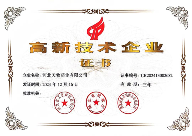 “高新技術企業”是國家為扶持和鼓勵高新技術企業發展、調整產業結構和提升國家經濟競爭力而設立的專項資質認定。該認定對企業核心自主知識產權、科技成果轉化能力、研發組織管理水平以及企業成長性等核心指標有著嚴格的要求和評審標準,是中國科技型企業綜合實力的權威認證。獲得此項殊榮,不僅是對河北天牧藥業多年來堅持技術驅動、專注創新的充分肯定,也是公司在動物藥品和飼料研發、生產領域技術領先地位和核心競爭力的有力證明。